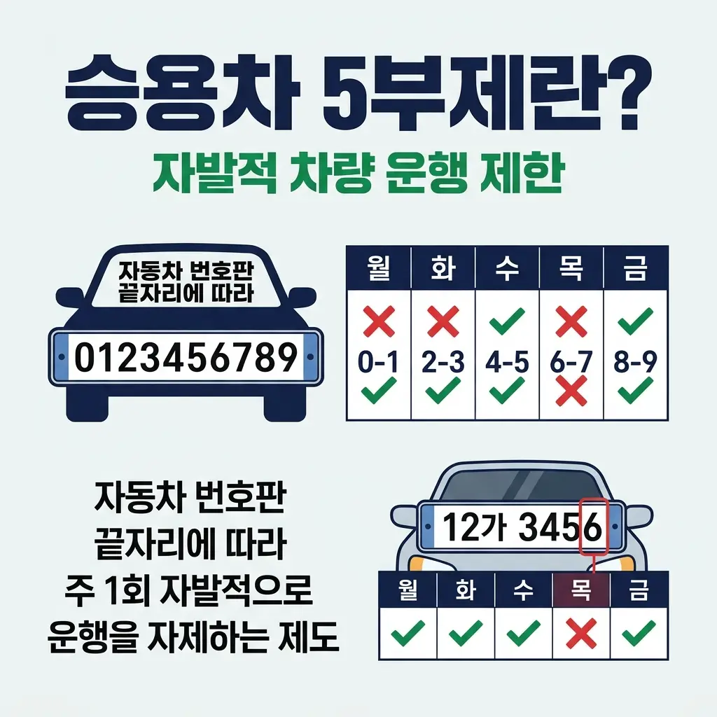 승용차 5부제(요일제)란 차량 번호판 끝자리 숫자를 기준으로 평일 중 하루를 지정해 해당 요일에 차량 운행을 자제하는 제도입니다. 2026년 3월 25일 0시부터 공공부문은 의무, 민간은 자율 참여 방식으로 전국에서 시행 중이며 토·일요일과 공휴일은 적용되지 않습니다.