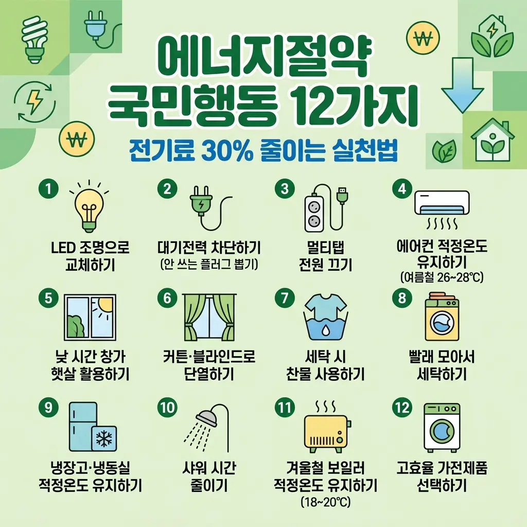 에너지절약 국민행동이란, 자원안보위기 경보 발령에 따라 기후에너지환경부가 2026년 3월 24일 국무회의를 통해 공식 발표한 생활 속 12가지 에너지 절약 실천 지침입니다. 이동할 때, 회사에서, 가정에서 누구나 바로 실천할 수 있는 항목으로 구성되어 있으며, 정부는 전 국민의 자발적 참여를 요청하고 있습니다.