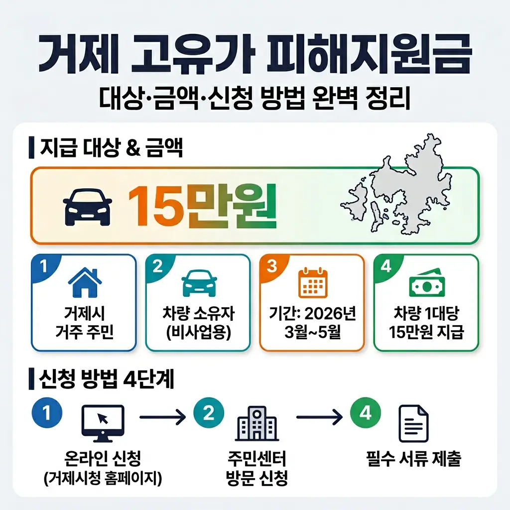 이 글을 읽으면 거제 거주자로서 고유가 피해지원금 수령 대상 여부와 받을 수 있는 금액을 5분 안에 확인할 수 있습니다. 기름값과 물가가 동시에 오르면서 매달 생활비 부담이 눈에 띄게 커진 상황입니다. 거제시 거주자가 이번 지원금에서 얼마를 받는지, 어떻게 신청하는지 핵심 내용만 정리했습니다.