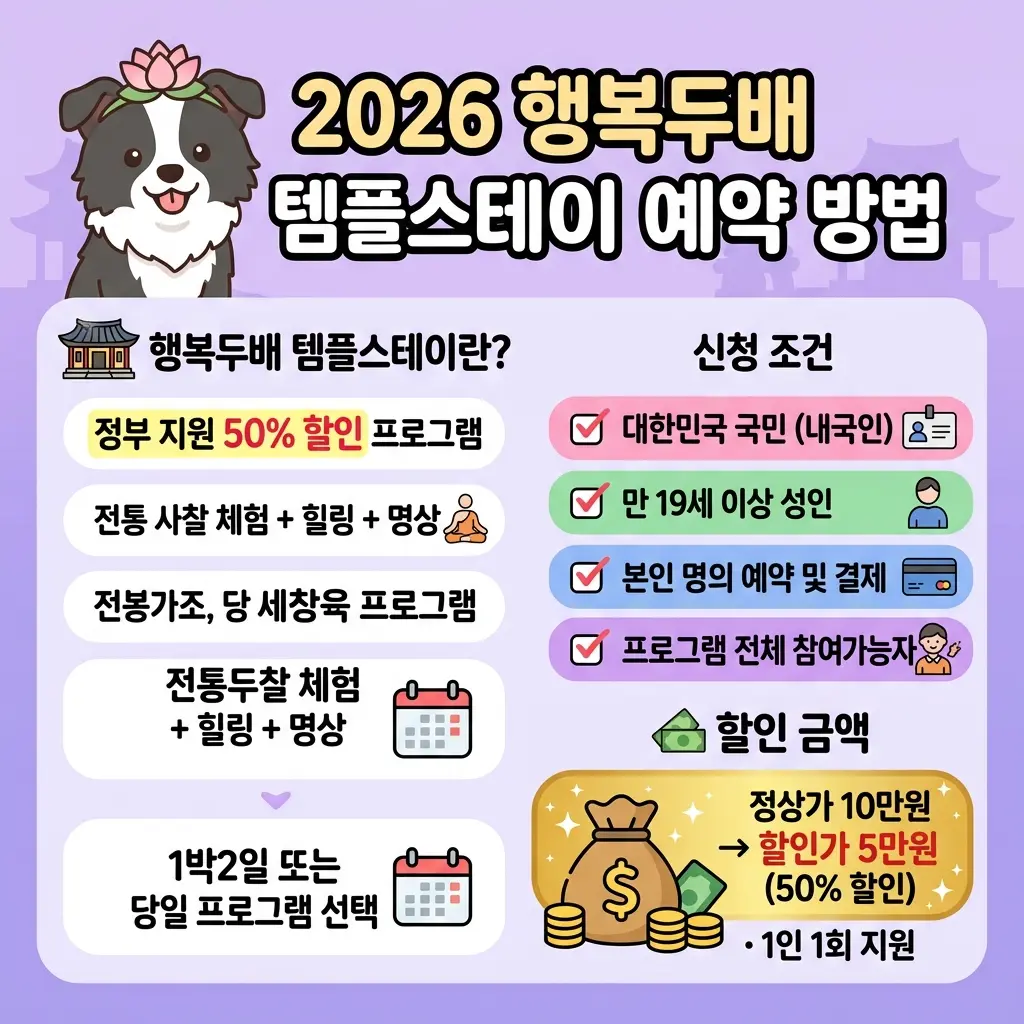 행복두배 템플스테이는 정부가 주관하는 ‘여행가는 달’ 캠페인의 일환으로, 전국 사찰에서 1박 2일 템플스테이를 3만 원, 외국인 당일형은 1만 5천 원의 특별 요금으로 체험할 수 있는 프로그램입니다. 2026년 5월 한 달 동안 운영되며, 사찰의 전통 문화와 수행 생활을 저렴하게 경험할 수 있는 기회를 제공합니다.
