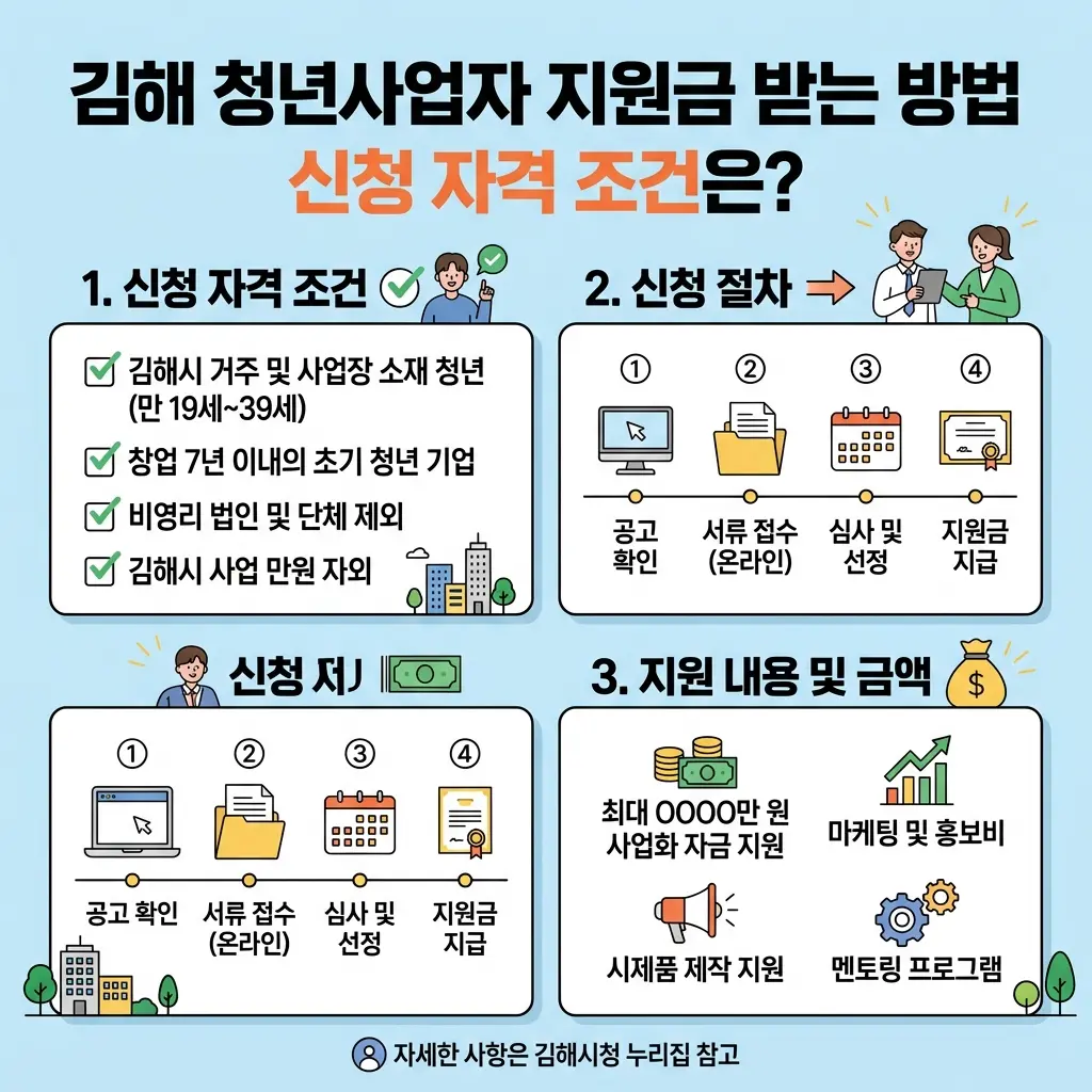 창업을 준비하거나 막 사업을 시작한 김해 청년이라면, 지금 이 순간 지원금을 놓치고 있을 수 있습니다. 김해시는 매년 청년 사업자를 위한 다양한 지원 제도를 운영하고 있지만, 공고 기간이 짧고 자격 조건이 복잡해 미처 신청하지 못하는 경우가 많습니다.
