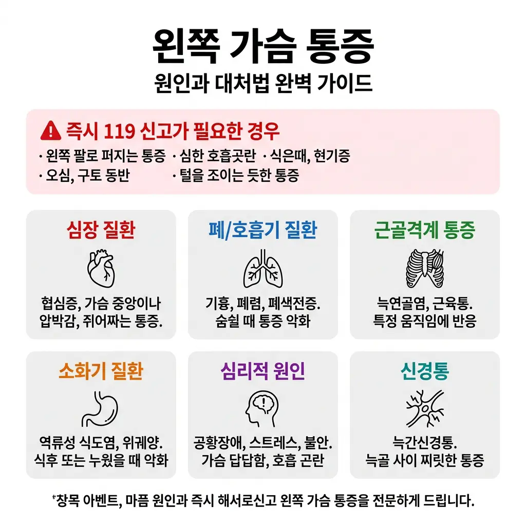 왼쪽 가슴 통증의 주요 원인은 크게 심혈관계, 근골격계, 소화기계, 호흡기계, 심리적 원인으로 나뉩니다. 심장 관련 통증은 쥐어짜거나 묵직하게 누르는 느낌이 특징이며, 팔·목·턱으로 퍼지는 방사통이 동반될 경우 즉시 응급실을 찾아야 합니다. 반면 찌르거나 콕콕 쑤시는 통증은 근골격계 원인일 가능성이 높습니다. 타는 듯한 명치 통증은 역류성 식도염을 의심할 수 있습니다.