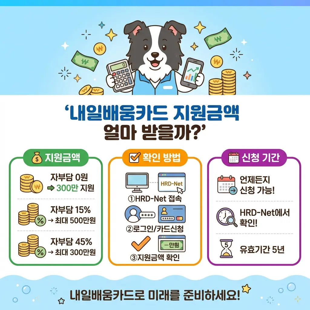 이 글을 읽으면 내일배움카드로 받을 수 있는 정확한 지원금액과 내 상황에서 얼마를 받을 수 있는지 5분 안에 확인할 수 있습니다. 훈련을 받고 싶은데 지원금이 얼마인지, 자비부담이 얼마나 되는지 몰라 망설이는 분들이 많습니다. 이 글에서는 기본 300만 원 한도부터 500만 원 추가 조건, 훈련장려금 계산법까지 2026년 최신 기준으로 한 번에 정리합니다.