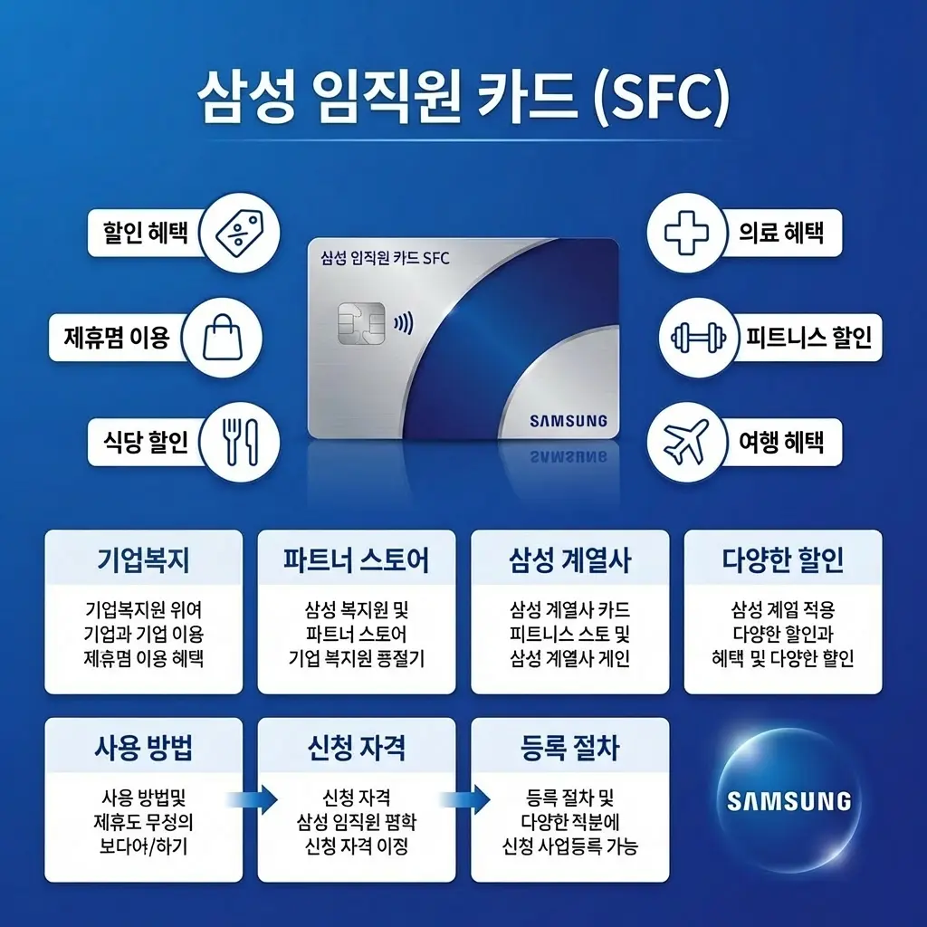 단순한 신용카드가 아닙니다. SFC는 삼성 임직원만을 위한 ‘전용 복지 플랫폼’이에요. 계열사 할인(삼성전자, 호텔신라 등)은 기본이고, 대출 금리 우대와 같은 금융 혜택까지 담겨 있죠. 웨딩이나 레저 예약 시에도 SFC 로고 하나로 대우가 달라지니 삼성인이라면 반드시 챙겨야 할 필수 아이템입니다.